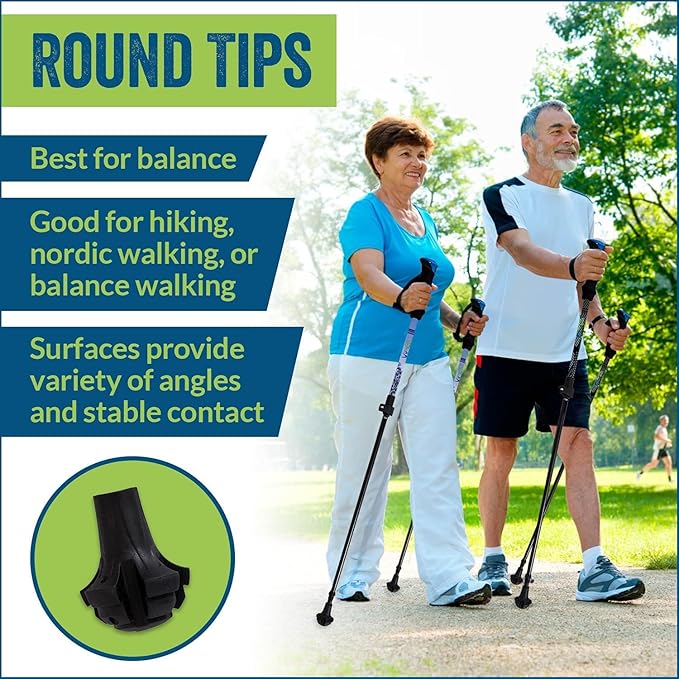 - THREE SHAPE CHOICES: Unique design provides stability for all types of hiking and walking. Choose Round for regular walking and hiking, great for balance and stability on variable terrain. Choose Tapered Medium for Nordic walking with maximum grip OR Choose Extra Firm for Nordic walking with a goal of durability over grip.