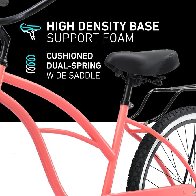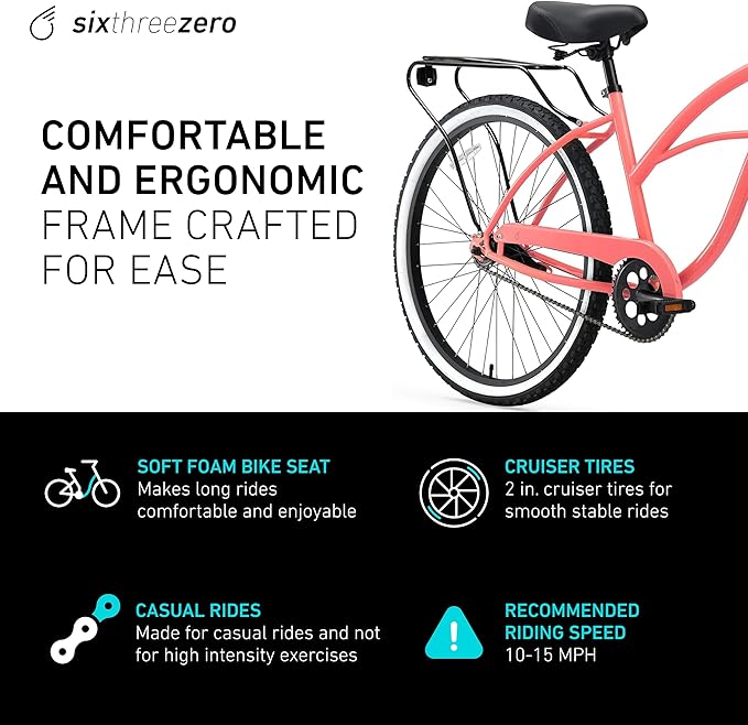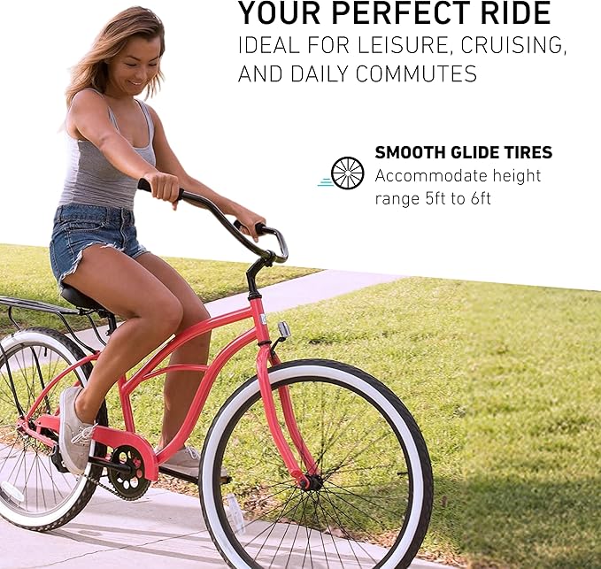 - BEACH CRUISER BIKE FOR WOMEN: Women’s beach cruiser with 17" steel frame. Designed for leisure, commuting, or casual rides on varied terrain. Holds up to 300 lbs. Fits riders 5’–6’