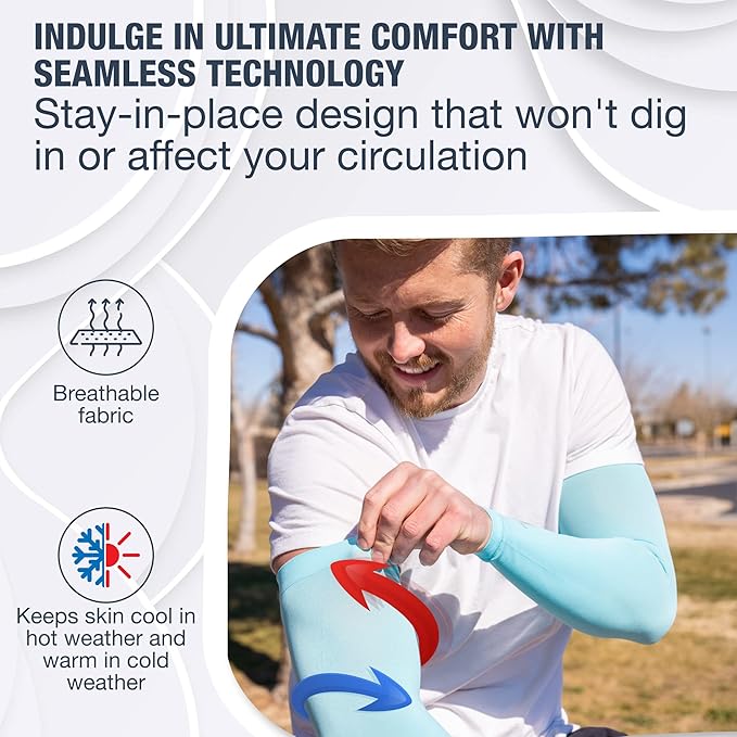 - Superior UPF 50+ premium arm sleeves – our innovative UV sleeves for men and women block over 98% of the sun’s harmful UVA and UVB rays, offering full UPF 50+ coverage. These sun sleeves for men and women are ideal for shielding yourself from the sun on hot days – whether you’re playing golf, basketball, baseball, volleyball, running, or cycling.