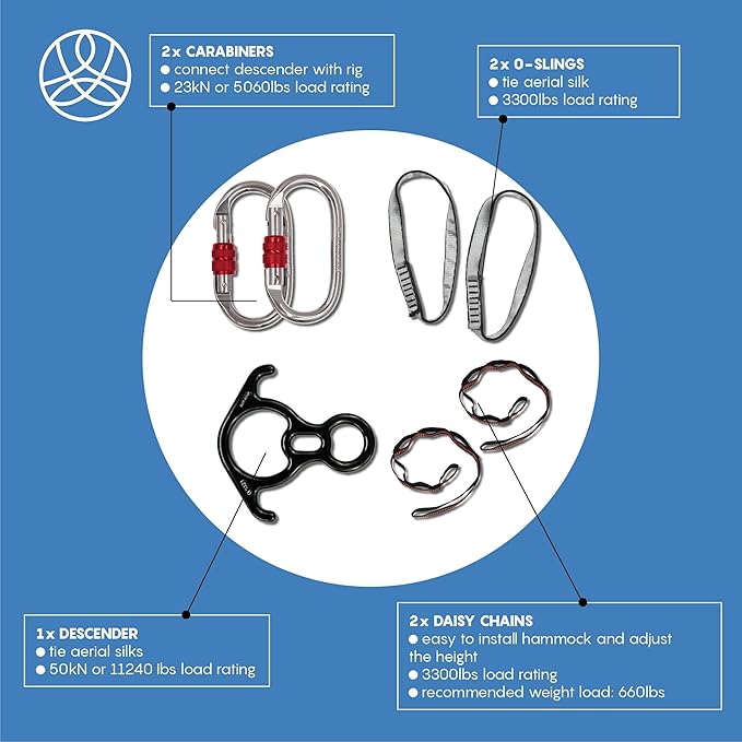 - ✔ PEACE OF MIND: Feel safe to perform climbs and drops with our climbing-grade hardware. Our aerial silks can hold up to 1800 lbs and accessories can withstand over 3000 lbf.