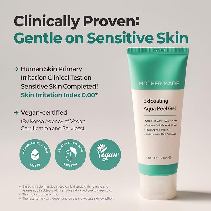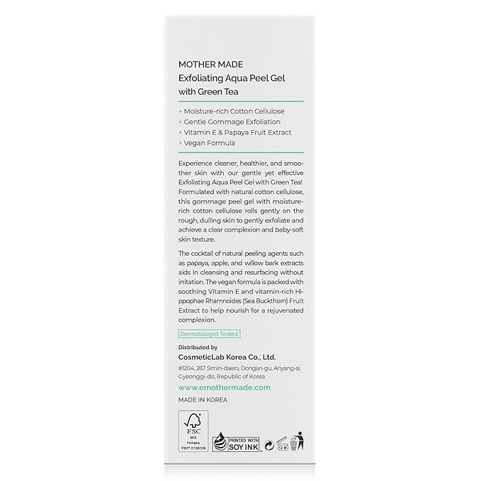 - Super Gentle Exfoliation To Skin: Unlike harsh microdermabrasion scrubs or strong chemical acid peels that dissolve proteins, MOTHER MADE Exfoliating Aqua Peel Gel is formulated with moisture-rich cellulose fiber that softly balls up with grime only, without strong chemicals or stress to skin