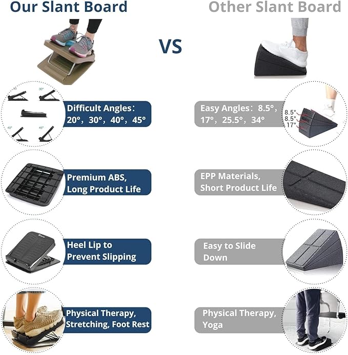 - Robust and Durable ABS Construction: Built from premium ABS material, this slant board ensures exceptional durability and withstands daily rigorous use, outperforming standard foam wedges and yoga blocks for both intensive training and rehabilitation exercises. Supports up to 300 lbs.