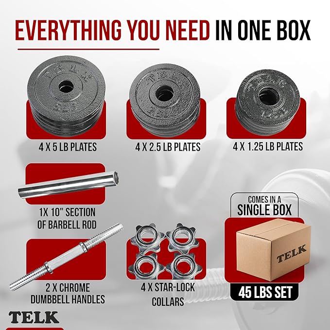 TELK – Adjustable Dumbbell Set – Home Gym Weight Set with Baked Enamel Cast Iron Plates – Space-Saving Free Weights for Strength Training