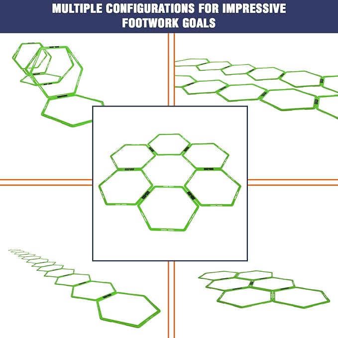 - ULTRA-DURABLE HEXAGONAL SPEED: Heavy-duty plastic agility training equipment is tough enough to handle countless sessions and withstand the inevitable stomps and kicks; Football ladder enhances speed, agility, and footwork.