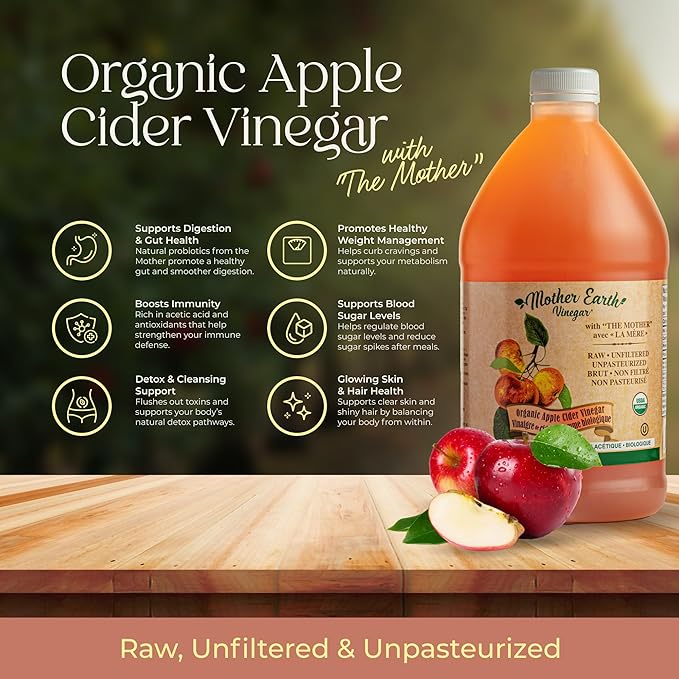 - LOVED BY VINEGAR PURISTS AND FOODIES - Against a backdrop of industrially made vinegars, Mother Earth stands out. Premium organic apples. Traditionally crafted. Processed to 5% acidity.