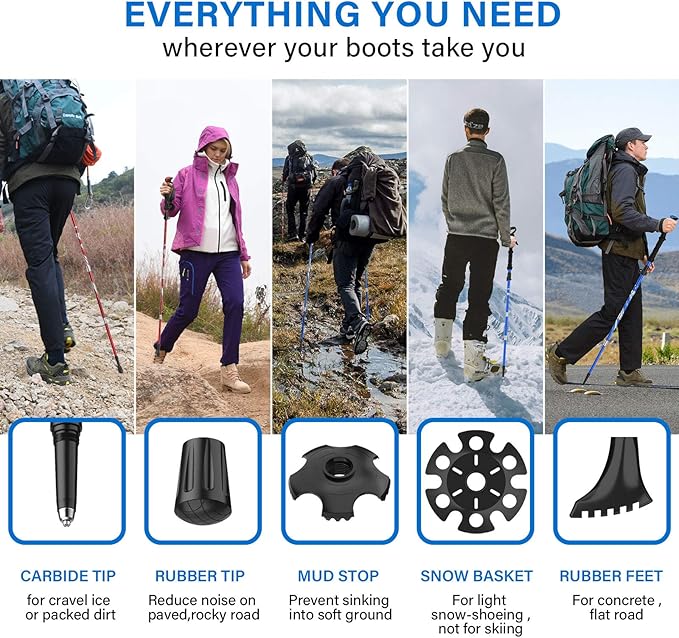 - 【ALL TERRAIN, ALL CONDITIONS】From climbing ice mountains to an easy urban walk, heavy-duty 4 season accessories (1 pair of each rubber tips, boot tips for hard surfaces, snow baskets, mud & sand baskets) and a tungsten carbide tip won’t let you down. 1 pair of carrying bags for storage and transport is also included in this hiking gear.