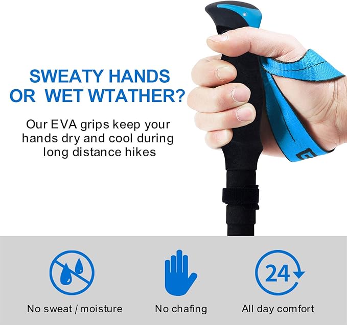 - 【COMPACT DESIGN, MORE CONVENIENT TO CARRY】This trekking poles’ retractable tri-fold design let them collapse down to a portable 13.8 inches (35 cm) easily and quickly. Fitting into a backpack, luggage cases, or duffel bags for compact travel! When in use, you can extend your poles from 45.3" all the way to 53.2" quickly. These canes are available in red and blue colors and are an excellent gift for fashion-conscious people.
