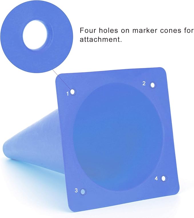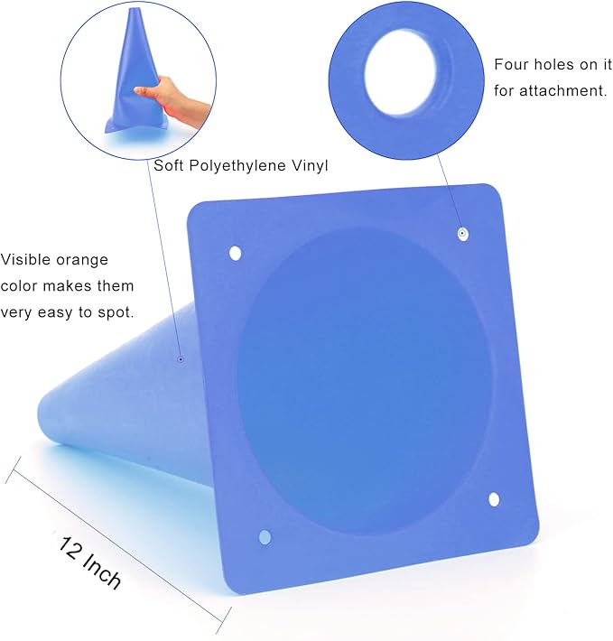 - Size - measures 12 inches in height, 6.7 inches in diameter. Four holes on safety cones for attachment, if it is a windy day, you do not need to worry it will blow all over the place.