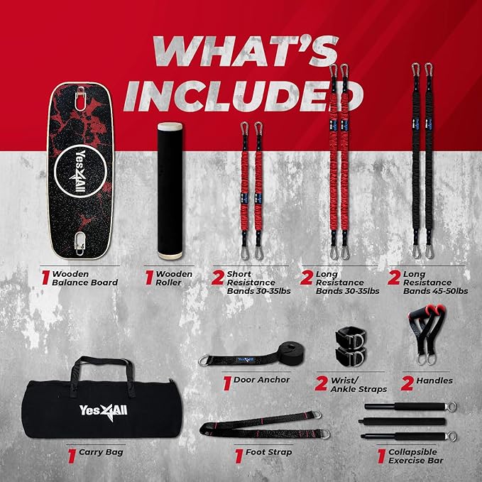 - PROFESSIONAL PORTABLE HOME GYM SYSTEM: This Portable Home Gym Package is a total workout system that replaces traditional equipment, saving you thousands of dollars while adding portability and versatility; Combo includes a Premium Balance Board, 6 Resistance Bands ranging from 30 to 50 pounds, 2 Wrist Straps, 2 Handles, 1 Exercise Bar, 1 Door Anchor, 1 Foot Strap & 1 Carry Bag; Incredibly effective at toning your body and leave you more energized by promoting blood flow to become body boss