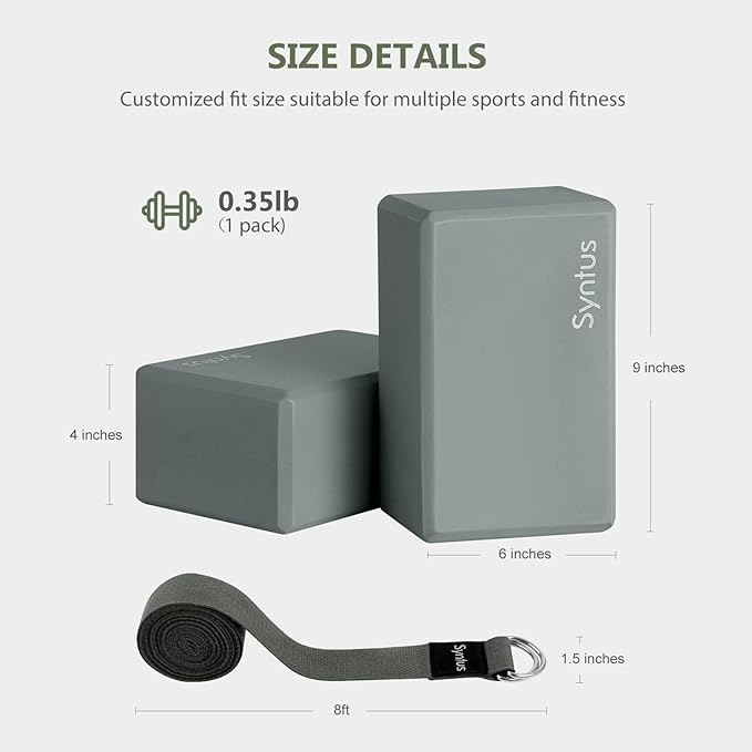 Syntus Yoga Block and Yoga Strap Set, 2 Soft Non-Slip Yoga Blocks 9×6×4 inches, 8FT Metal D-Ring Strap for Yoga, General Fitness, Pilates, Stretching and Toning