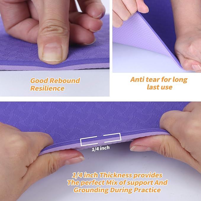 - 🧘♀️【Durable and Spacious TPE Yoga Mat】Our yoga beginners kit includes a premium TPE yoga mat with double-sided non-slip surfaces and two color options. Measuring 72"L x 24"W, it provides ample space and a 6mm (1/4in) thick for optimal comfort and support. The fast rebound technology reduces impact force, protecting your joints while maintaining stability.