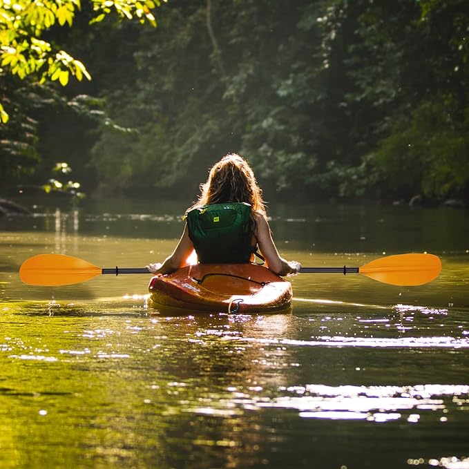 - CARBON DESIGN - LIGHTWEIGHT & DURABLE: Made of premium quality 1.25mm thick, 29mm diameter carbon fiber composite shaft, and fiberglass reinforced polypropylene blades, this kayak paddle is impact and erosion resistent, thus for great durability. It weighs only 33 oz, and is perfect for beginner and intermediate kayakers.
