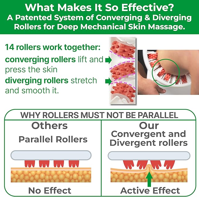 - 🔬 International patented triple-action system: Unlike many look-alike cellulite removers with simple parallel rollers that barely affect the skin, this device features a unique system of converging rollers that lift and firmly squeeze the skin, followed by diverging rollers that stretch and smooth it. If the rollers were parallel, they would have little or no real effect.