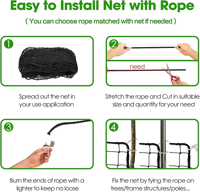 - 【Easy to install 】 Comes with a 10m(33ft) installation rope, you can install the hitting net easily,4 steps can help you to hang up the mesh netting quickly. Step 1: Find some tree branches, ropes, poles, etc. that you can hang your pitting baseball net from, Stretch the rope and cut it in a suitable size and quantity for your needs. Step 3: Burn the ends of the rope with a lighter. This way it won't come loose easily.Step4:Fasten the rope to a branch or pole, and frame structures.