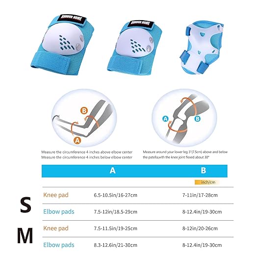 • 🌸【Recommended Age for Kids 】SOHOUR HOME Kids Knee Pads and Elbow Pads 6 pack contains: 2 pcs Knee pads /2 pcs Elbow Pads / 2 pcs Wrist Guards With Portable Breathable Canvas Mesh Bag. Size Suggest: S: for 3-7 Years old, M: for 6-15 Years old.