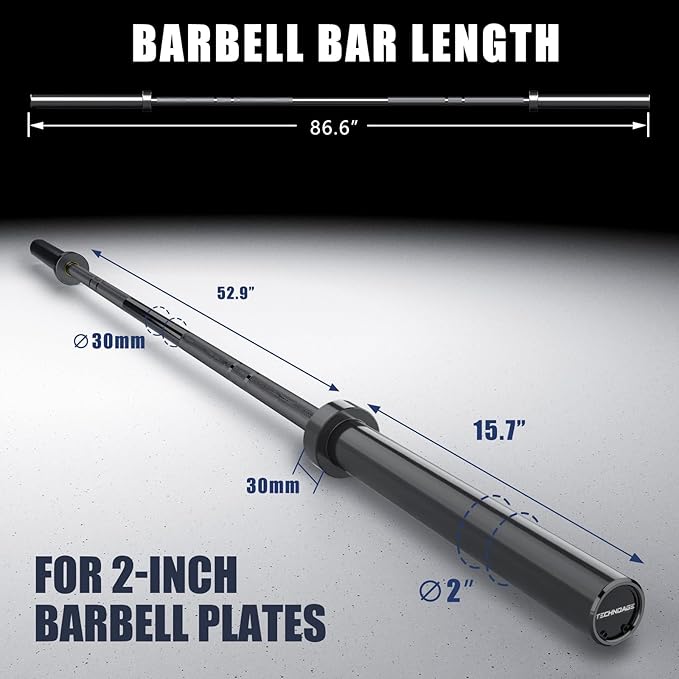 - [Spec] The barbell weighs 40 pounds (18 kilograms) and measures 86.61 inches (7 feet) in length. The sleeve's loadable length is 15.7 inches, making it suitable for a 2-inch barbell. The barbell features a 30mm diameter medium double knurled grip design. Strong enough to load 700LBS/320KG, Fits standard 2-in weight plates.