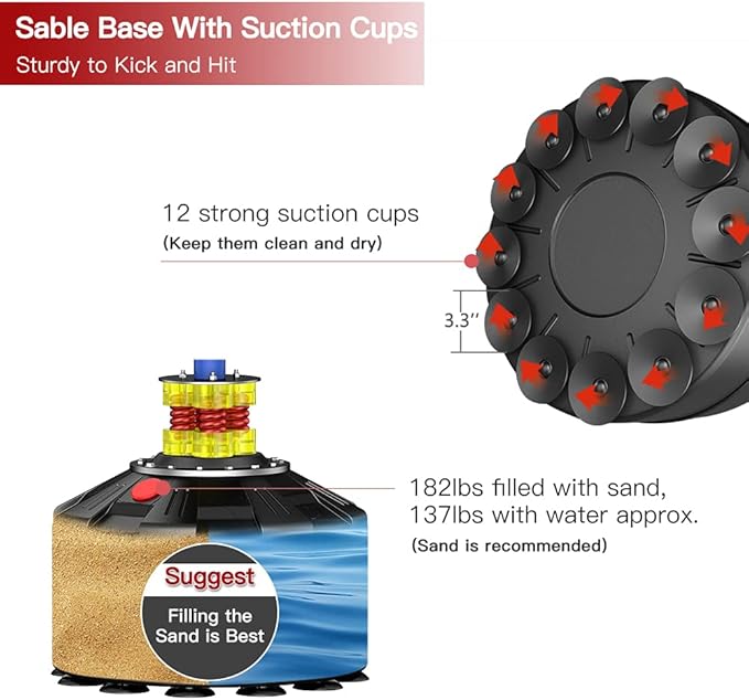 - Stable Floor Sucking Base: Rounded ABS base tank is engineered for easy roll relocation. Includes 12 strong suction cups beneath to stop base movement. Please keep the suction cups clean and use them on smooth floors. Sand is highly recommended as the filling material. Weighs up to 205 lbs when filled with sand ensure max stability