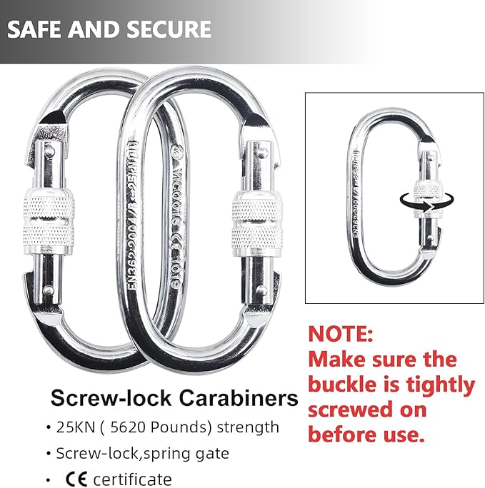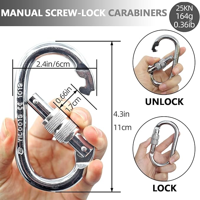 - 【Premium Safe O-Shape Carabiners】The manual latch is made of steel and has a maximum breaking load of 25KN (5620 lbf). It can be tightened before use without any safety hazards and can be used with confidence.