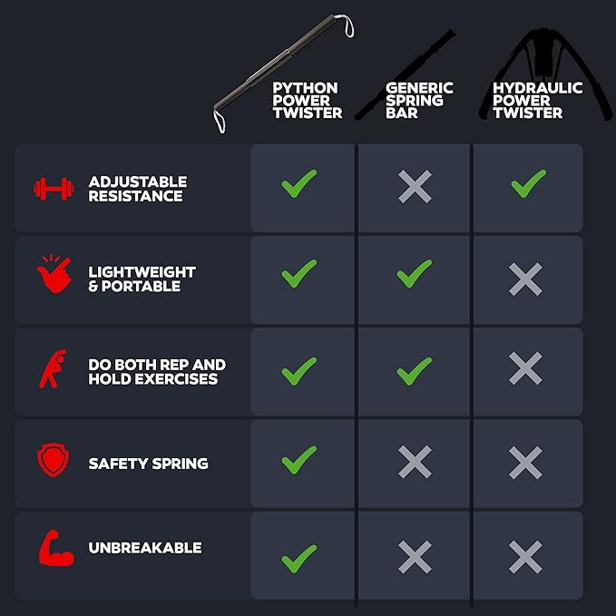 - Quality you can feel from the durable spring bar, quality build, and comfortable rubber grip handles. We are sure that you will be satisfied with the high-quality design and construction of the Python Power Twister by Core Prodigy - Fitness and Rehab Equipment Leader.