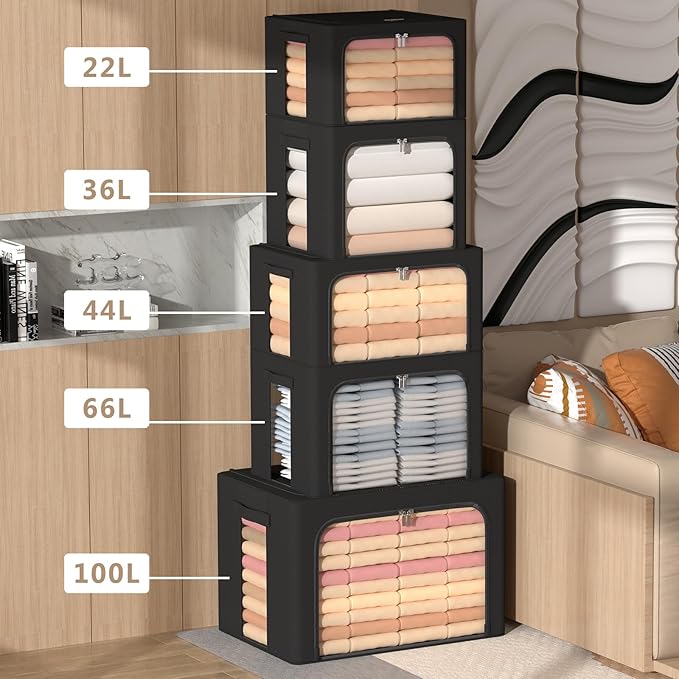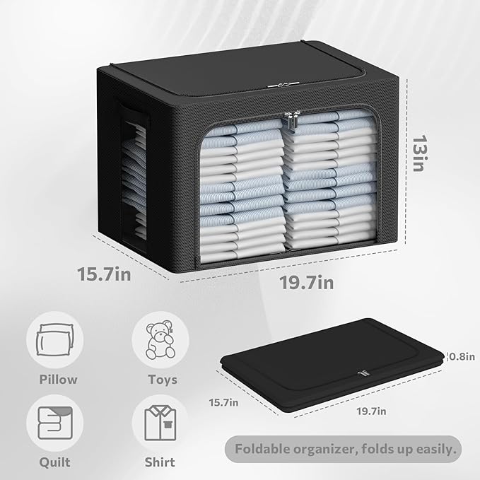 3Pack Frame Storage Box - Clothes Storage Bin Bags Oxford Fabric Foldable Stackable Container Organizer Set with Clear Window & Carry Handles (Black, Large-66L)