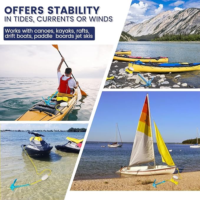 • ⚓【SIMPLE FUNCTION】No installation required. Just slide up the grappling anchor, open 4 flukes, slide the anchor ring back and lock it in position. Use as much anchor rope as possible to create better horizontal drag on the bottom surface of a pond, river, lake or ocean. The buoy can help you to easily identify and target your position in the water.