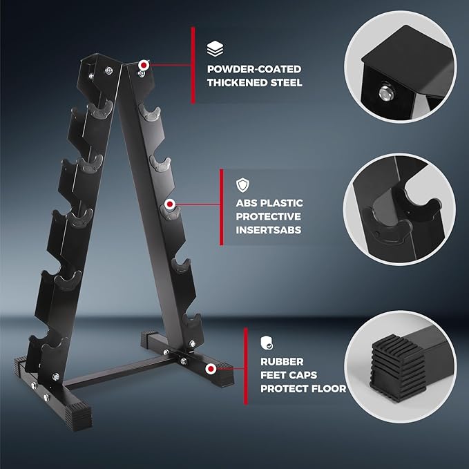 - Compact and Space-saving Rack: This weight rack features a heavy-duty construction with incredibly compact three-tiered design, allowing you to place it anywhere for your easy accessibility. Three angled horizontal shelves offer efficient barbell loading and retrieval. The solidly welded triangular base, with four non-skid feet, reinforces its overall structural stability. In addition to dumbbell storage, this rack can store kettlebells, medicine balls, yoga blocks, etc.