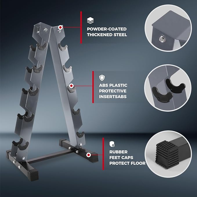• Compact and Space-saving Rack: This weight rack features a heavy-duty construction with incredibly compact three-tiered design, allowing you to place it anywhere for your easy accessibility. Three angled horizontal shelves offer efficient barbell loading and retrieval. The solidly welded triangular base, with four non-skid feet, reinforces its overall structural stability. In addition to dumbbell storage, this rack can store kettlebells, medicine balls, yoga blocks, etc.