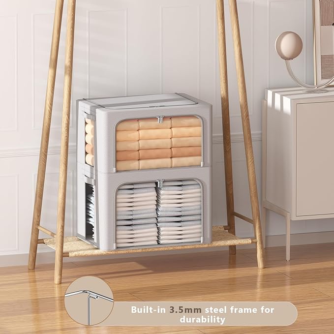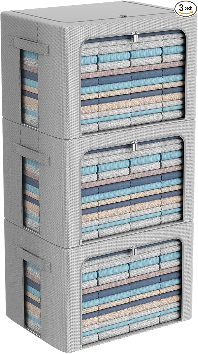3Pack Frame Storage Box - Clothes Storage Bin Bags Oxford Fabric Foldable Stackable Container Organizer Set with Clear Window & Carry Handles (Grey, Extra Large-100L)