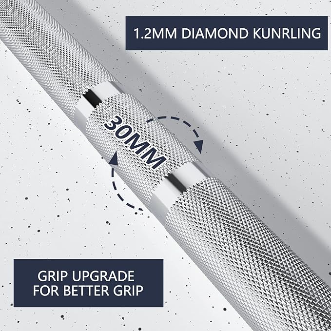 - [Spec] The barbell weighs 40 pounds (18 kilograms) and measures 86.61 inches (7 feet) in length. The sleeve's loadable length is 15.7 inches, making it suitable for a 2-inch barbell. The barbell features a 30mm diameter medium double knurled grip design. Strong enough to load 700LBS/320KG, Fits standard 2-in weight plates.