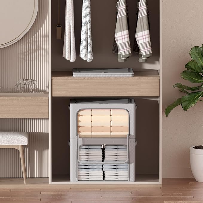 3Pack Frame Storage Box - Clothes Storage Bin Bags Oxford Fabric Foldable Stackable Container Organizer Set with Clear Window & Carry Handles (Grey, X-Small-36L)