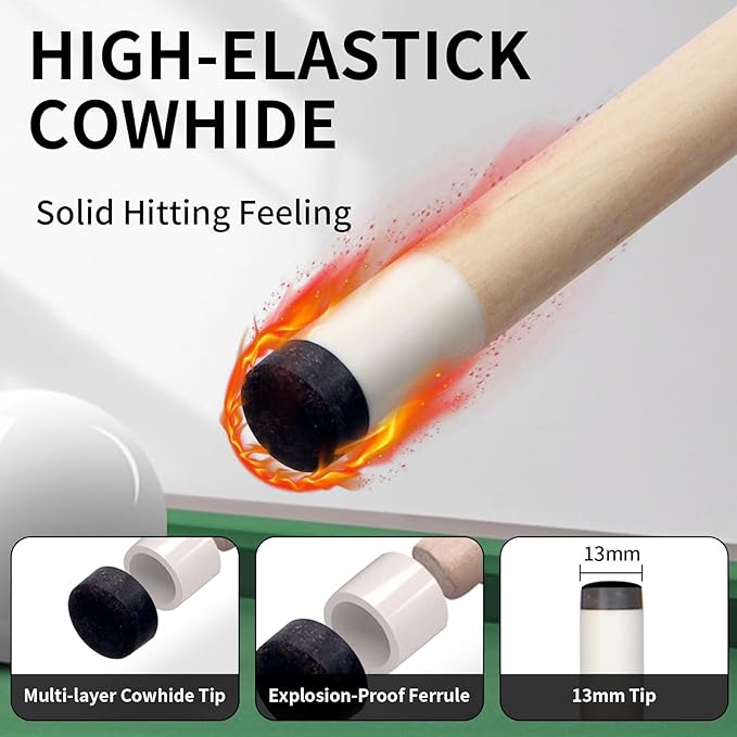 - Comfortable Pool Stick: The grip is leather-wrapped, cracked texture, sweat-absorbing and non-slip, comfortable to hold for a long time without tiring hands, reducing deflection and improving accuracy