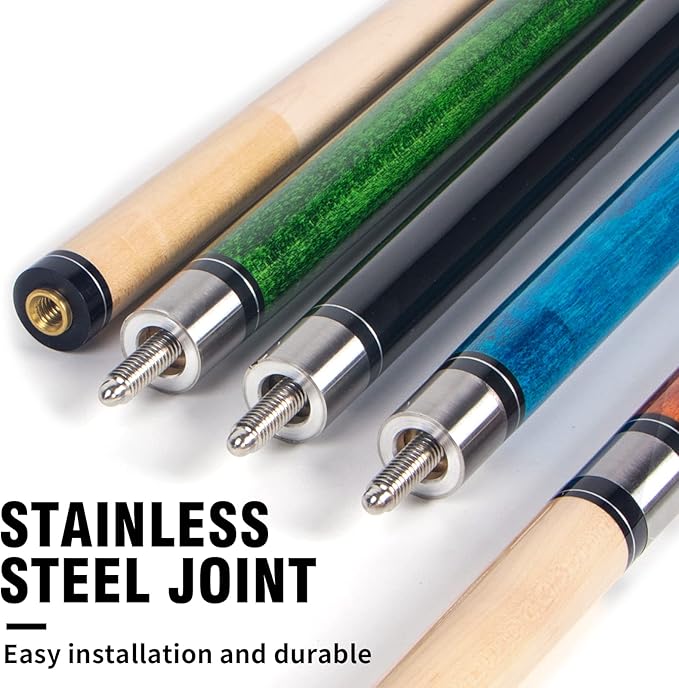 • Canadian Maple Wood:Firm and durable, we have chosen the best quality for the pool stick and the pool cue tips durability. Each pool cue case contains 4 unique pool cues sticks