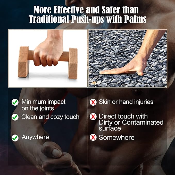 - Stable & Durable Design: Push up bars is crafted from premium solid beech wood; Non-slip rubber base enhances workout stability; Protects hardwood floors from scratches
