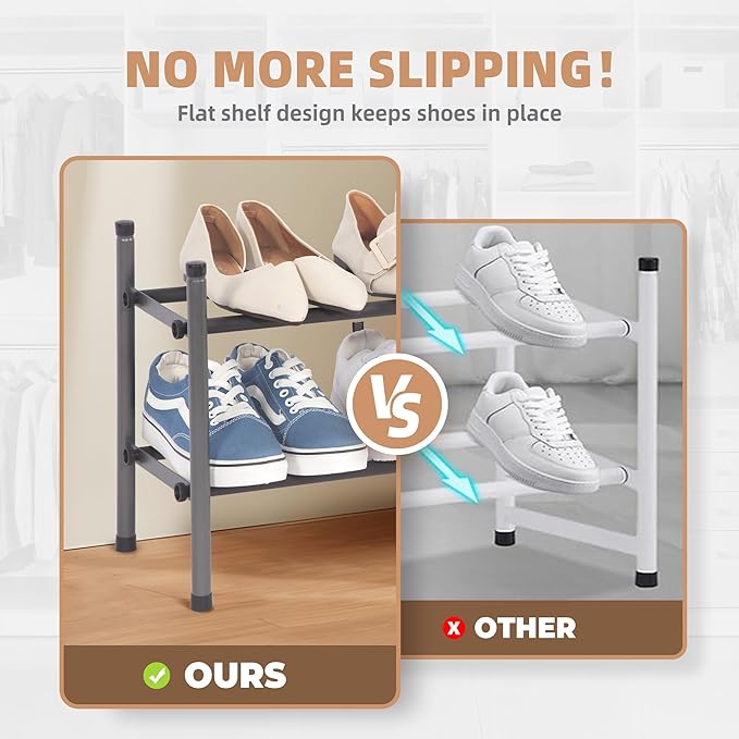 - STACKABLE - This shoe rack can save the floor space and maximize the use of vertical space. The 2 tier shoe rack can be purchased in any combination to meet different needs, like 4-Tier, 6-Tier, 8-Tier, 10-Tier etc. The metal shoe rack fits any small space
