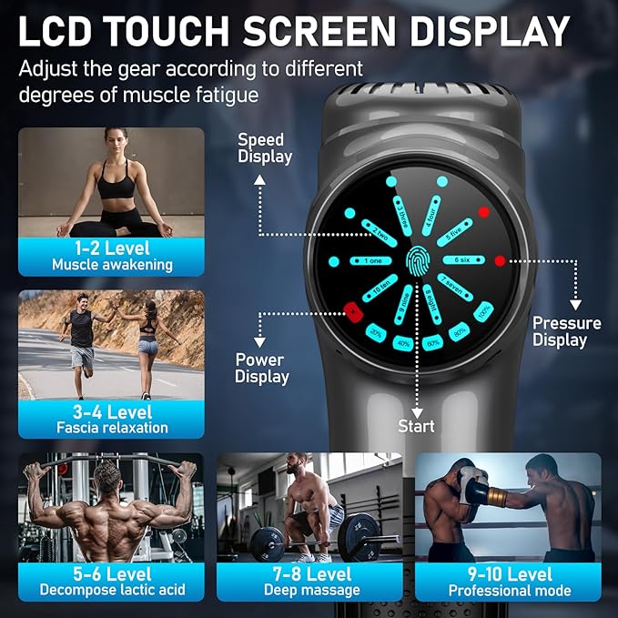 - Smart LED Screen & Battery Design: The massage gun is equipped with an LED display screen, which intuitively displays speed, battery percentage, and massage pressure