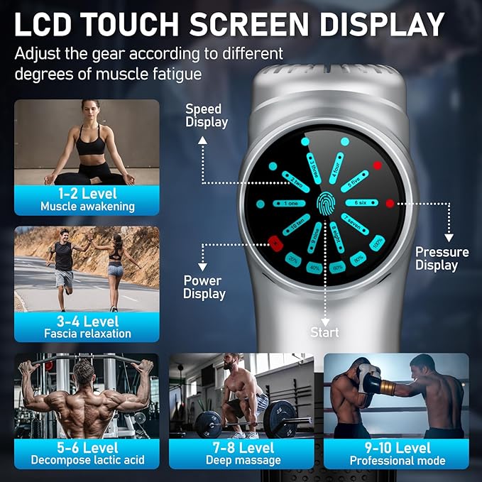 - 10 speed Levels: The handheld massager gun has 10 speeds, which can meet the muscle soreness problems encountered by athletes and fitness professionals. The noise level is only 40 decibels, it won't disturb others