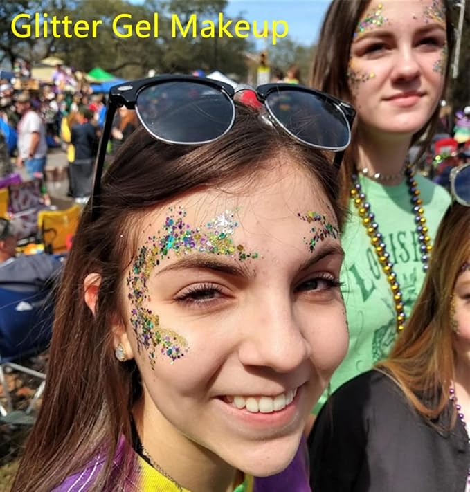 - Mardi Gras Glitter Wildly Use:This cosmetic chunky and fine glitters can be used to either complement your makeup look or just add some sparkle to other parts of your face and body.Great for face, body, eyeshadow, lips, cheeks, hair, nail art, and more.Great accessories for Singer Concerts,Music Festival,Rave,music festivals, weddings, parties, parades, football tailgates, and on stages around the world.