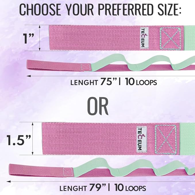 - STRETCHING STRAP. Color: LAVENDER GREEN. Material: POLYPROPYLENE. Width: 1 IN. Length: 75 IN. 10 Loops. Non-elastic. Superior Non-slip Grip.