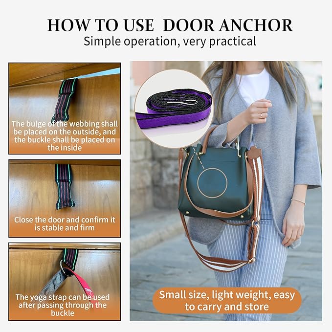 - 【EQUIPPED WITH DOOR STOP&PORTABLE】It has a wide range of use scenarios, and is very suitable for going out, working in the studio or at home. We are equipped with a door anchor, so we can easily use our yoga straps anytime, anywhere. Especially, it's more efficient to use it after warm-up, exercise and exercise; Perfect for dancers and athletes, it can also be used for physical therapy, Pilates and yoga.