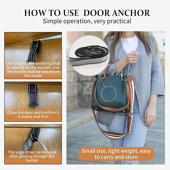 - 【EQUIPPED WITH DOOR STOP&PORTABLE】It has a wide range of use scenarios, and is very suitable for going out, working in the studio or at home. We are equipped with a door anchor, so we can easily use our yoga straps anytime, anywhere. Especially, it's more efficient to use it after warm-up, exercise and exercise; Perfect for dancers and athletes, it can also be used for physical therapy, Pilates and yoga.