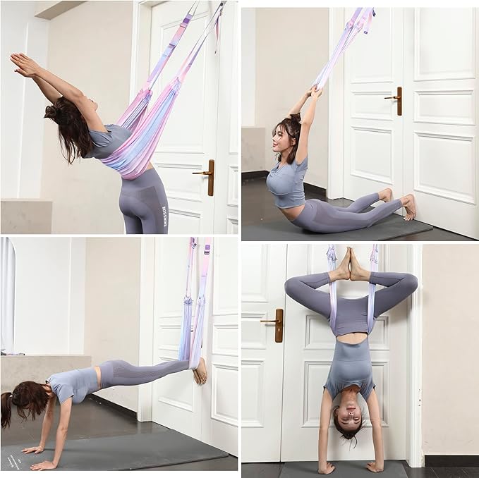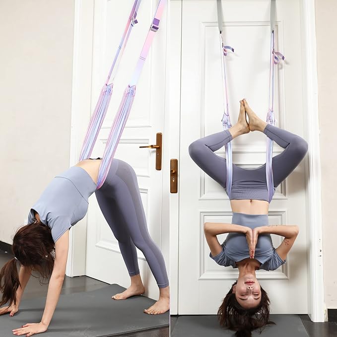 - Thoughtful Tip: The design of the hanging ring will not damage the door frame and stay in place, This yoga fitness equipment for flexibility which is over the door stretch strap will not scratch or damage your door and This leg stretching equipment for flexibility which is over the door stretch strap will not scratch or damage your door and won't move or slide while you're stretching your legs waist