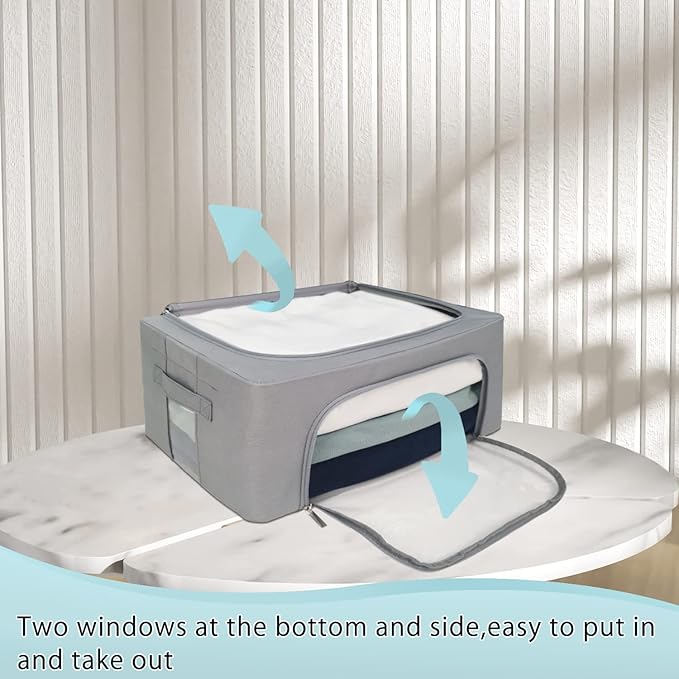 Clothes Storage Box Bins Stackable Foldable Organizer,Sturdy Handles with Metal Frame for Clothing Bedding Shelves,Closet Container with Clear Window Zipper and Label Holder (Gray, 22L x3 Pack)