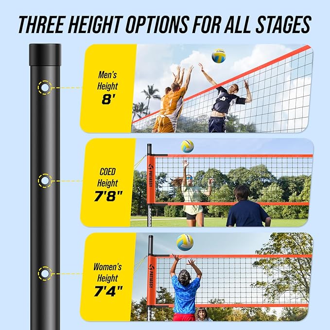 - Adjustable Height for Versatile Play: This volleyball net features 3 adjustable height options – 8' for men height, 7.8' for co-play, and 7.4' for women – making it perfect for all skill levels, including a volleyball net for backyard, outdoor/grass volleyball net for fun and practice