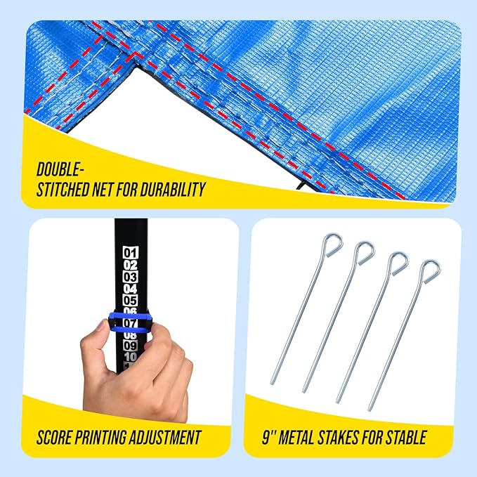 - Stable and Secure with Tensioning Set: The included tensioning ropes with stakes ensure that the net prevents sagging or drooping. The upper and lower tension straps help maintain the net's tautness, keeping your outdoor volleyball net stable and reliable