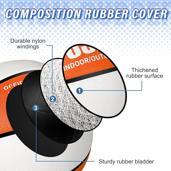 - Long Time Service: the training basketball is made of quality thickened rubber material, with nice flexibility, elasticity, and stability; 2 Ply butyl bladder makes the ball firm and not easy to deflate, so you can use it for a long time; The surface of the basketball is made of large particles, which provides the best adhesion for pitching, passing and dunking