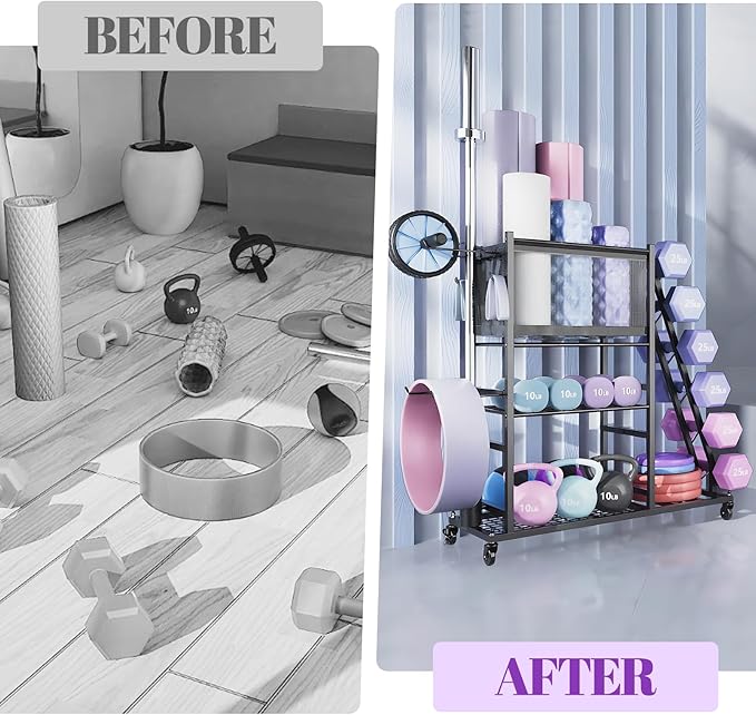 - 【Store It All – One Rack for All Gear】This all-in-one dumbbell rack stores your dumbbells, kettlebells, barbells, plates, yoga mats, resistance bands, balls, and more—creating a clutter-free fitness zone for the whole family. From strength training to flexibility work, everything you need is right where it should be.