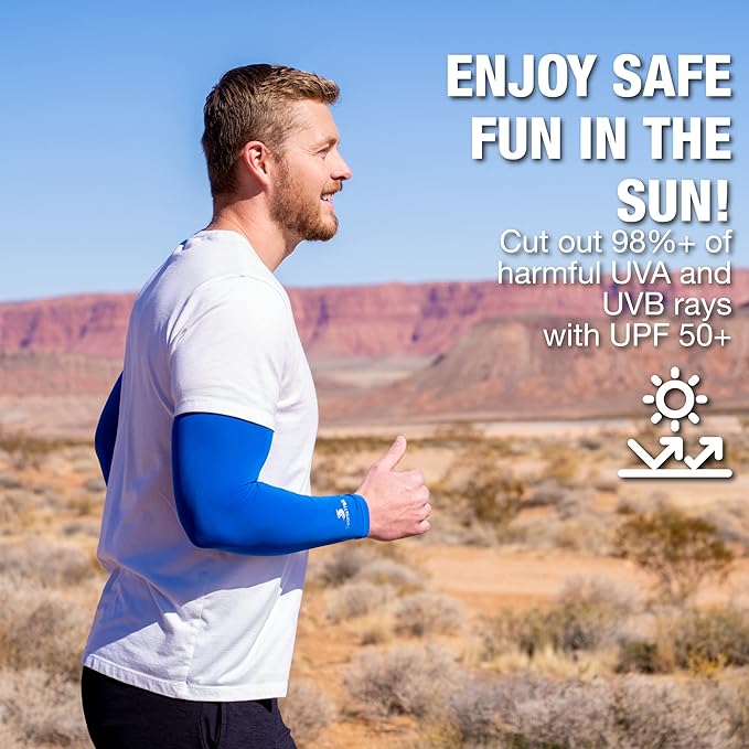 • Superior UPF 50+ premium arm sleeves – our innovative UV sleeves for men and women block over 98% of the sun’s harmful UVA and UVB rays, offering full UPF 50+ coverage. These sun sleeves for men and women are ideal for shielding yourself from the sun on hot days – whether you’re playing golf, basketball, baseball, volleyball, running, or cycling.