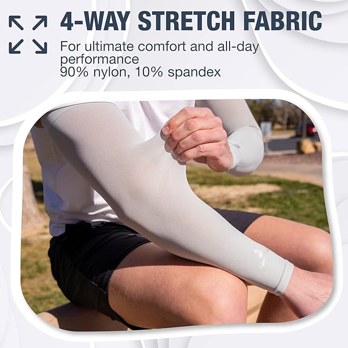 • Whether you’re wearing arm sleeves for sun protection, support during sports & exercise, or to cover tattoos at work, you need arm guards that are comfortable & easy to wear. But many arm covers for women & men either cut off circulation or roll down your arms constantly. At Sportstrail, our cooling arm sleeves feature a seamless design & highly durable 90% nylon, 10% spandex material that forms to your arm like a glove – for a perfect 360° fit.