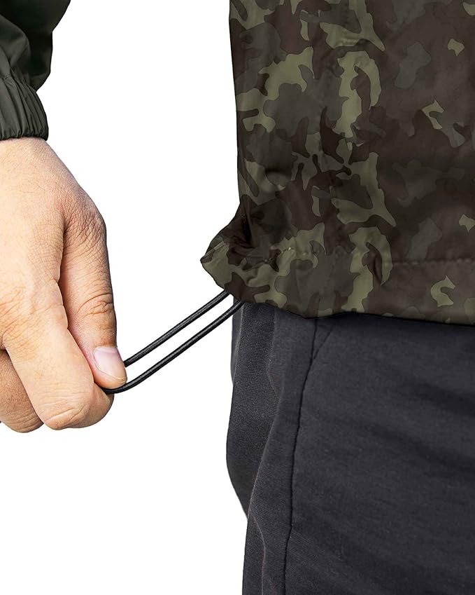 - ?�Unique Design?‘Lightweight lite rain jacket elastic cuffs prevent the rain drops to the cuffs; Adjustable drawcord hood to prevent yourself from being wet; The hem contains elastic rope for warmth and keep you dry. Suitable for casual wear, outdoor sports, outdoor work, traveling, cycling, hiking, climbing, fishing, camping, hunting.