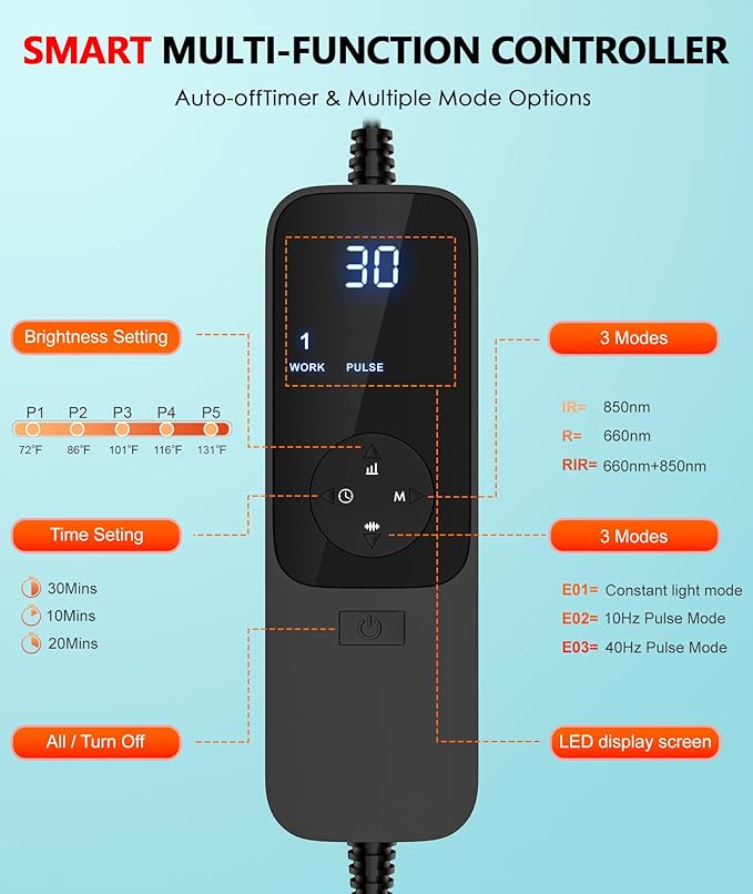 - 💡[2025 New Large Pad ] 31.5" x 11.8" large red light therapy mat, meet the need for treat-ment of the entire back. Heating pad features with 5 adjustable brightness levels, each level has steady luminance and pulse modes, Also equipped with a 10-30 min timer with auto off function.